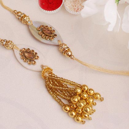 This is the set of two rakhis. If you are looking for a unique rakhi for your brother and sister-in-law, this Bhaiya and Bhabhi Rakhi set is perfect. You can buy designer rakhi, pearl rakhi, gold rakhi, etc.