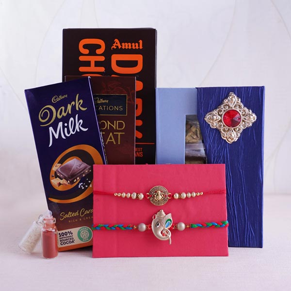 Rakhi •Rakhi Type: One Golden Rakhi and one designer Rakhi •Set Type: Set of 2 •Recipient: Brothers •Color: Multicolored •Material Used: Gold-platted metal, zardosi motif, beads, and silk threads Chocolates •1 Amul Dark Chocolate of 150gm •1 Dark Milk Salted Caramel of 72gm •Assorted Chocolate of 100gm in a box Other Items: •A packet of Roli and Chawal with containers are also included