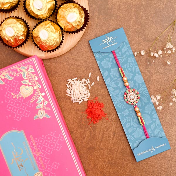 Product Details One American Diamond Flower Rakhi, This designer rakhi exhibits American diamond flower, Ferrero Rocher, Quantity- 3 Pcs, Complimentary Roli Chawal packed in a small card, Beautifully packed in Sneh Box