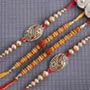 Product Overview: • Rakhi Type: Two golden meenakari Rakhis and two Rudraksha Rakhis • Set Type: Set of 4 Rakhi • Recipient: Brothers • Color: Multicolored • Material Used: Stones, beads, gold-plated metal, and silk thread • Roli & Chawal pack and containers are included with Rakhi set