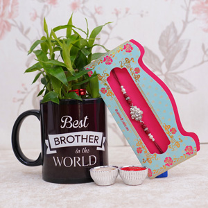 Lucky Bamboo with Pearl Rakhi N Mug Combo