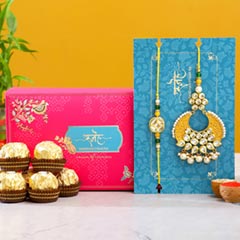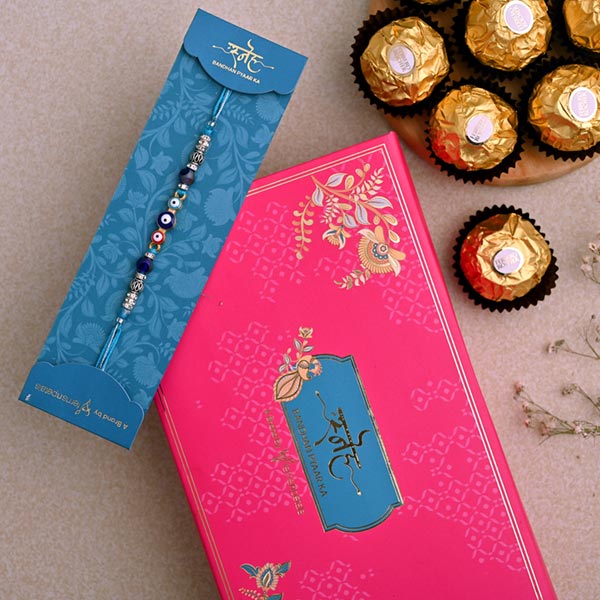 Product Details One Evil Eye Designer Rakhi, This designer rakhi highlights an evil eye for spiritual protection, Ferrero Rocher, Quantity- 3 Pcs, Complimentary Roli Chawal