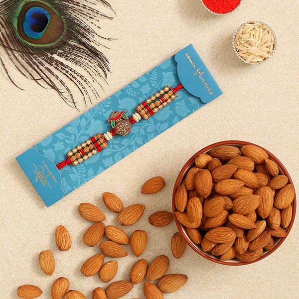 Product Details: One Kalash Rudraksha Rakhi, This ethnic rakhi displays kalash & rudraksha for an auspicious look, Haldiram Kaju Katli, Weight- 400 gms, Complimentary Roli Chawal packed in a small card, Beautifully packed in Sneh Box