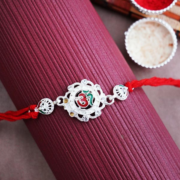 Product Details: • Rakhi Type: Silver Rakhi • Set Type: Single • Recipient: Brother • Color: Multicolored • Material Used: Silver-plated metal, stones, and a thread • Brand: sendrakhi.com • Roli & Chawal are included with containers