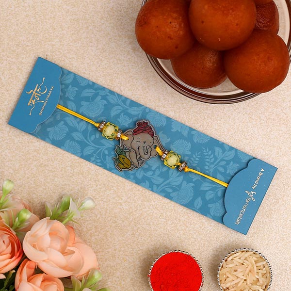 Product Details One Bal Ganesha Kids Rakhi, , One Gulab Jamun Tin- 1 Kg, Complimentary Roli Chawal packed in a small card, This Rakhi is packed & delivered in a Beautiful Traditional Sneh Rakhi Box,