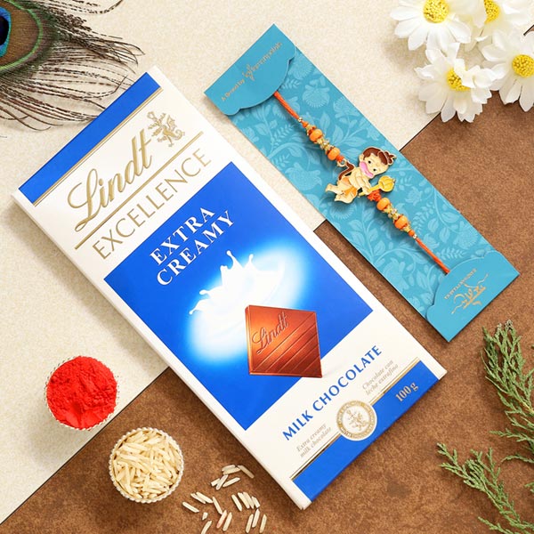Product Details One Bal Hanuman Kids Rakhi, Bal Hanuman Rakhi is categorically designed for kids who are fond of devotional cartoon characters, This Rakshabandhan, gift your little brother/sister a cute Rakhi, Lindt Excellence Extra Creamy Bar- 100 gms