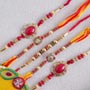 Product Overview: • Rakhi Type: Two stone Rakhis and three beaded Rakhis • Set Type: Set of 5 Rakhis • Recipient: Brothers • Color: Multicolored • Material Used: Stones, pearls, beads, gold-plated metal, and silk thread • Pack of Roli & Chawal and containers are free with Rakhi set