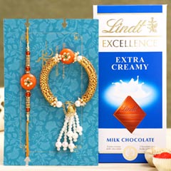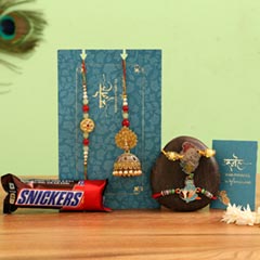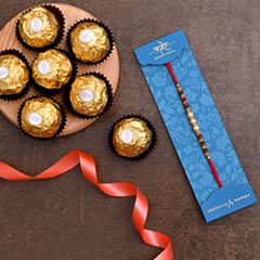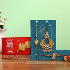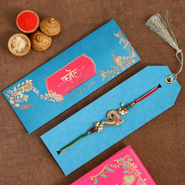 Product Details , One Peacock Designer Rakhi, This designer rakhi showcases beautiful peacock for an eye catching look, Complimentary Roli Chawal packed in a small card, This Rakhi is packed in a beautiful Sneh envelope