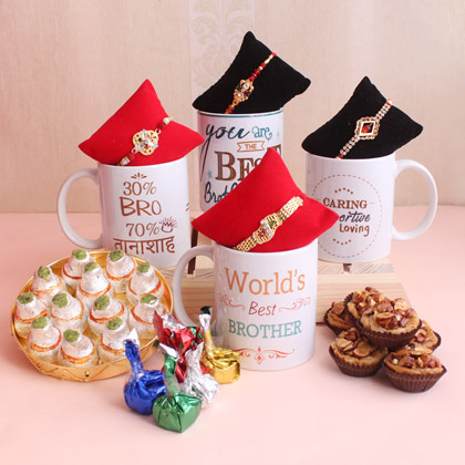 4 Golden Rakhis which are decorated with pearls, beads and stones along with meenakari work.