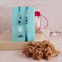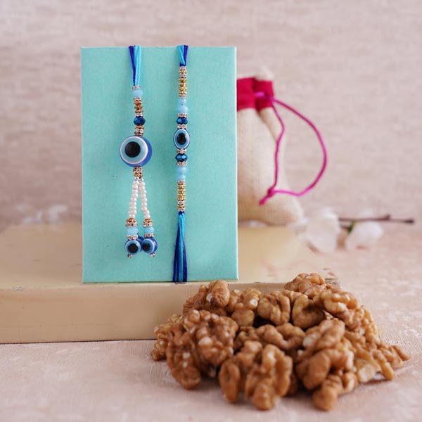 Rakhi • Rakhi Type: Bhaiya Bhabhi Rakhi Set • Set Type: Set of Two • Recipient: Brother and Sister-in-Law • Color: Multicolored • Material Used: Evil Eye stones, beads, and silk threads • A packet of Roli and Chawal with containers Dry fruits • 100 gm Walnuts in a designer potli