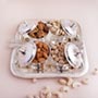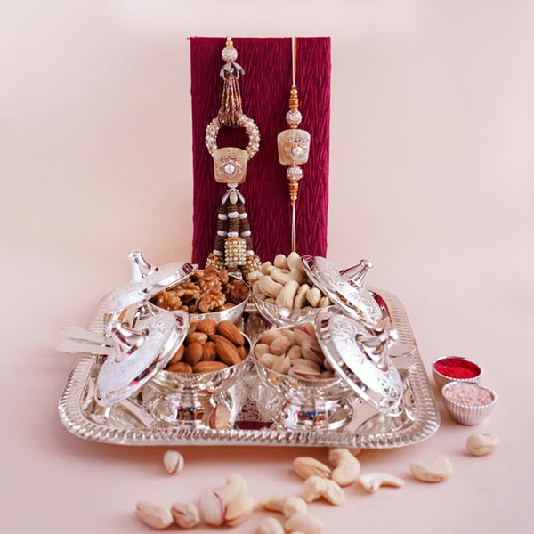 Product Details: • Rakhi Type: Bhaiya Bhabhi Rakhi Set • Set Type: Set of Two • Recipient: Brother and Sister-in-Law • Color: Multicolored • Material Used: Gold-plated metal, AD stones, beads, and silk threads • A packet of Roli and Chawal with containers Dry fruits • 100 grams Cashews • 100 grams Almonds • 100 grams Pistachios • 100 grams Walnuts Other Gifts • One designer silver tray with four bowls and spoons