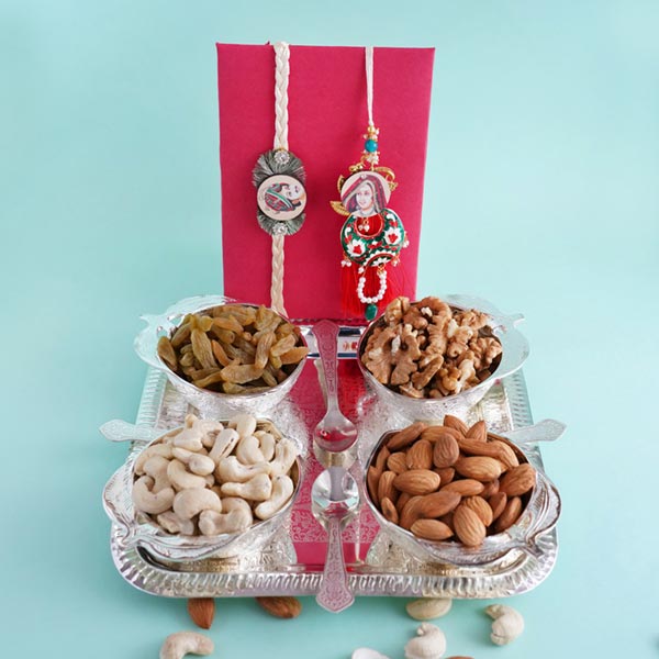 Product Details: • Rakhi Type: Bhaiya Bhabhi Rakhi Set • Set Type: Set of Two • Recipient: Brother and Sister-in-Law • Color: Multicolored • Material Used: Gold-plated metal, beads, stones, and silk threads • A packet of Roli and Chawal with containers Dry fruits • 100 grams Cashews • 100 grams Almonds • 100 grams Raisins • 100 grams Walnuts Other Gifts • One designer silver apple-shaped tray with four containers and spoons