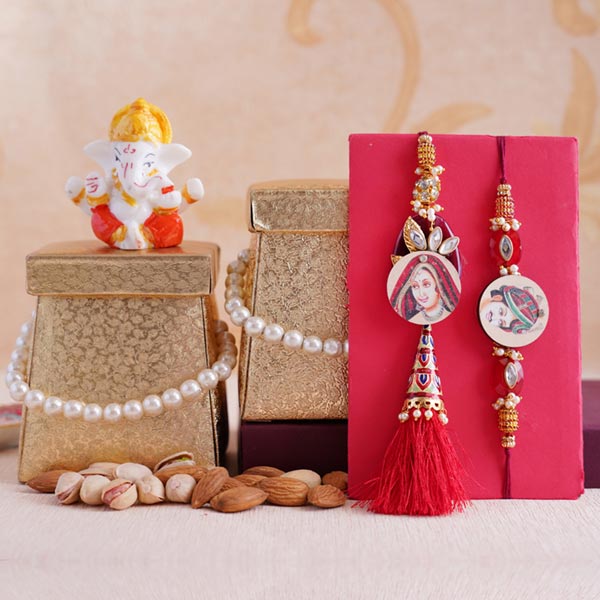 Rakhi • Rakhi Type: Bhaiya Bhabhi Rakhi Set • Set Type: Set of Two • Recipient: Brother and Sister-in-Law • Color: Multicolored • Material Used: Gold-platted metal, beads, stones, Kundan, and silk threads • A packet of Roli and Chawal with containers Dry fruits • 100 gm Pistachios in a designer golden container • 100 gm Almonds in a designer golden container Other Gifts • A Ganesha idol