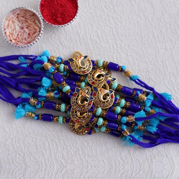 Product Details: • Rakhi Type: A Set of Twelve Golden Ganesha Rakhis • Set Type: Set of Twelve • Recipient: Brother • Color: Multicolored • Material Used: Gold-plated metal, stones, beads, and a silk thread • Brand: sendrakhi.com • Roli & Chawal with containers are included with this Rakhi set