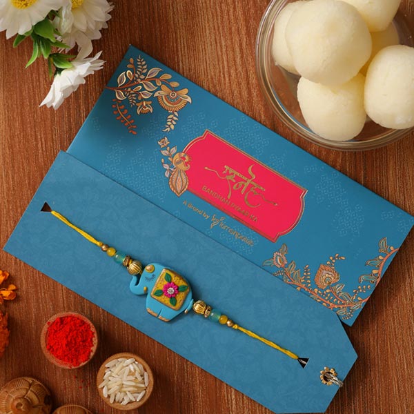 Product Details One Blue Elephant Kids Rakhi, This Kids Rakhi showcases a blue elephant & pearl detailing, One Rasgulla Tin- 1 Kg, Complimentary Roli Chawal packed in a small card, This Rakhi is packed & delivered in a Beautiful Traditional Sneh Rakhi Box,
