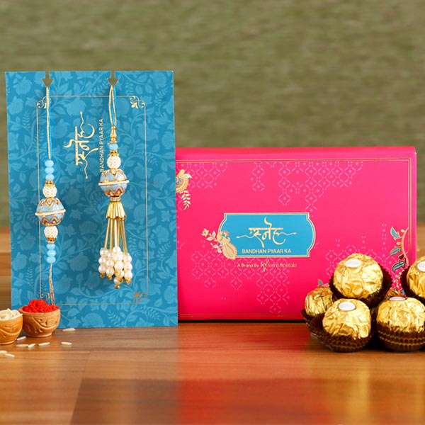 Product Details: One Bhaiya Bhabhi Lumba Rakhi Set, Exquisitely designed with blue pearls, Haldiram Kaju Katli, Weight- 400 gms, Complimentary Roli Chawal packed in a small card, Beautifully packed in Sneh Box