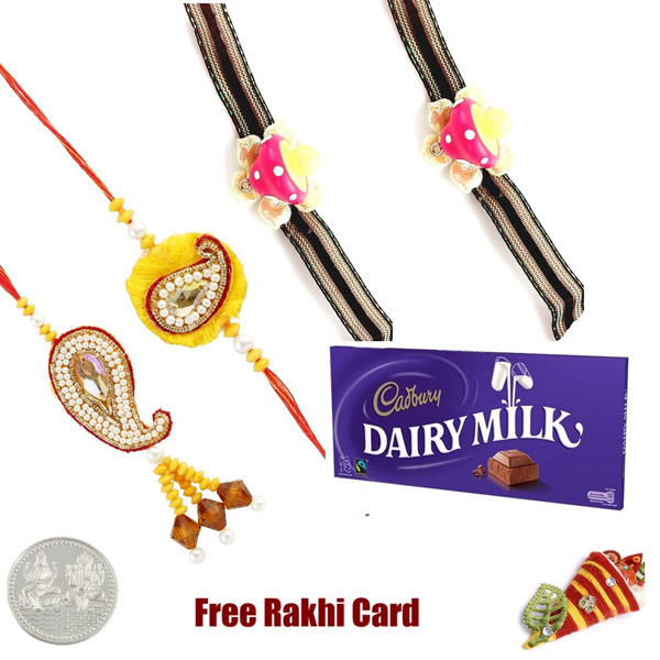 Send your favorite chocolate to your brother this Raksha Bandhan. This product comes with a Free Zardosi Family Rakhi Set, Roli Tikka, Rakhi Card and 5 gram Silver Plated Silver Coin Chocolate Weight: 3.5 Ounces. Delivery only in Canada. Shipment will be sent via USPS First class international mail with tracking number and delivery confirmation. Please place your final order by August 16th, 9 PM Central Time for assured delivery on August 26th 2018.