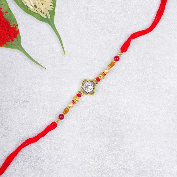 Traditional Golden Pearl Rakhi And 3 Pcs Ferrero Rocher
