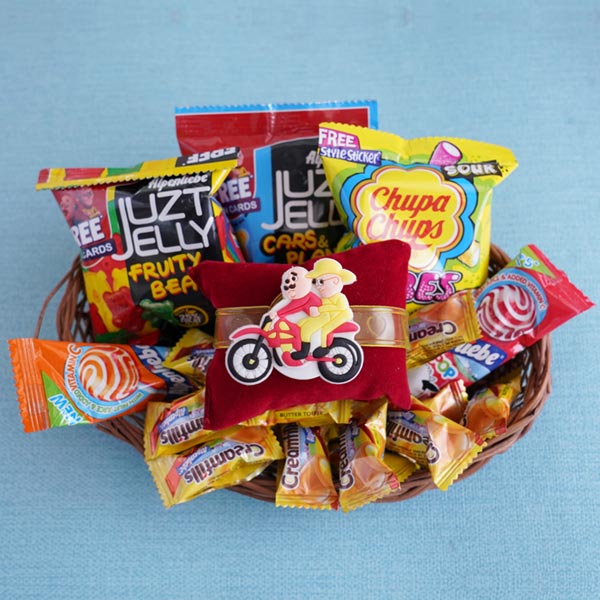 Rakhi •Rakhi Type: Motu Patlu Kids Rakhi •Set Type: Set of 1 •Recipient: Brothers •Color: Multicolored •Material Used: Silicone, beads, and stylish band Chocolates •1 Goodie Box of 99gm filled with chocolates Other Items: •A packet of Roli and Chawal with containers are also included •A designer wooden tray is also included with this Rakhi with chocolates hamper