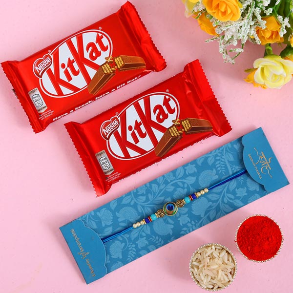 Product Details: This designer rakhi showcases pearl detailing for an ethnic look, Kitkat Chocolate- 2 Pcs, Weight- 42 gms each, Complimentary Roli Chawal packed in a small card, Beautifully packed in Sneh Box,