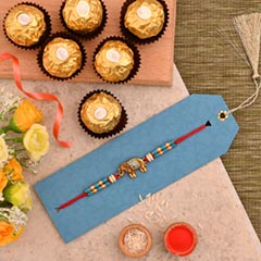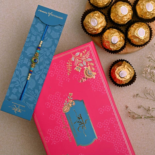 Product Details One Circular Peacock Feather Rakhi, This devotional rakhi highlights peacock feather for good luck, Ferrero Rocher, Quantity- 3 Pcs, Complimentary Roli Chawal packed in a small card, Beautifully packed in Sneh Box