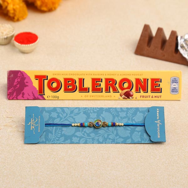 Product Details: One Pearl & Mauli Rakhi, This rakhi showcases pearl detailing for a serene look, Toblerone Chocolate Milk Bar, Weight- 100 gms, Complimentary Roli Chawal packed in a small card, Beautifully packed in Sneh Box