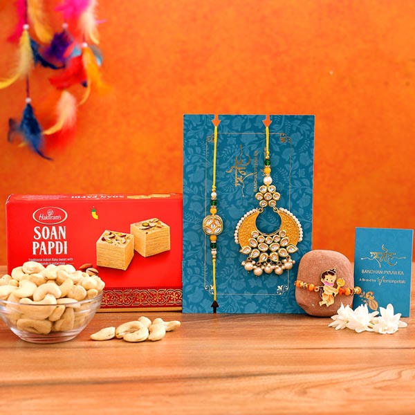 Product Details One Bhaiya Bhabhi Lumba Rakhi Set, This crescent shaped rakhi set is gracefully designed with yellow pearls, One Bal Hanuman Kids Rakhi, , Cashews- 100 gms, Soan Papdi- 250 gms,