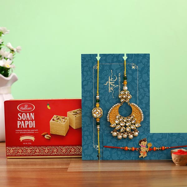 Product Details One Bhaiya Bhabhi Lumba Rakhi Set, This crescent shaped rakhi set is gracefully designed with yellow pearls, One Bal Hanuman Kids Rakhi, This Rakhi is categorically designed for kids who are fond of devotional cartoon characters, Soan Papdi- 250 gms,