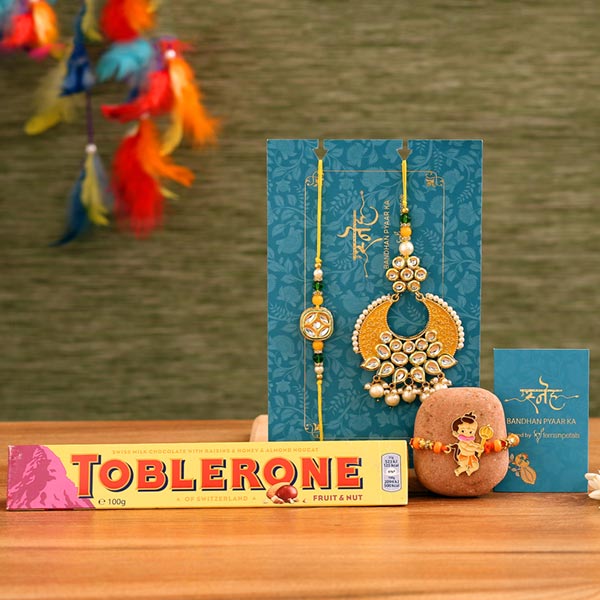 Product Details One Bhaiya Bhabhi Lumba Rakhi Set, This crescent shaped rakhi set is gracefully designed with yellow pearls, One Bal Hanuman Kids Rakhi, , One Toblerone Chocolate- 100 gms,