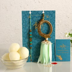 Product Details One Bhaiya Bhabhi Lumba Rakhi Set, This Lumba Rakhi set showcases dancing peacock & Jhumki style, Ferrero Rocher, Quantity- 3 Pcs, Complimentary Roli Chawal packed in a small card, Beautifully packed in Sneh Box