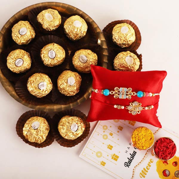 Traditional Pearl Mauli Rakhi And 3 Pcs Ferrero Rocher