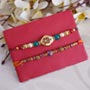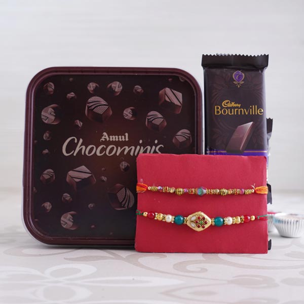 Rakhi •Rakhi Type: One beaded Rakhi and one Golden Rakhi •Set Type: Set of 2 •Recipient: Brothers •Color: Multicolored •Material Used: Gold-platted metal, beads, and silk threads Chocolates •Amul Chocominis of 250 gm •1 Bourneville of 31gm Other Items: •A packet of Roli and Chawal with containers are also included