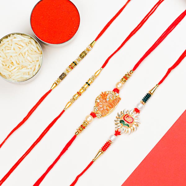 Set of 4 Rakhis ( 1 Ek Onkar, 1 Big Brother and 2 Designer Pearl Rakhis )