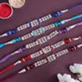 Product Overview: • Rakhi Type: Five AD Rakhis • Set Type: Set of 5 Rakhis • Recipient: Brothers • Color: Multicolored • Material Used: AD stones, beads, gold-plated metal, and silk thread • Pack of Roli & Chawal and containers are free with Rakhi set