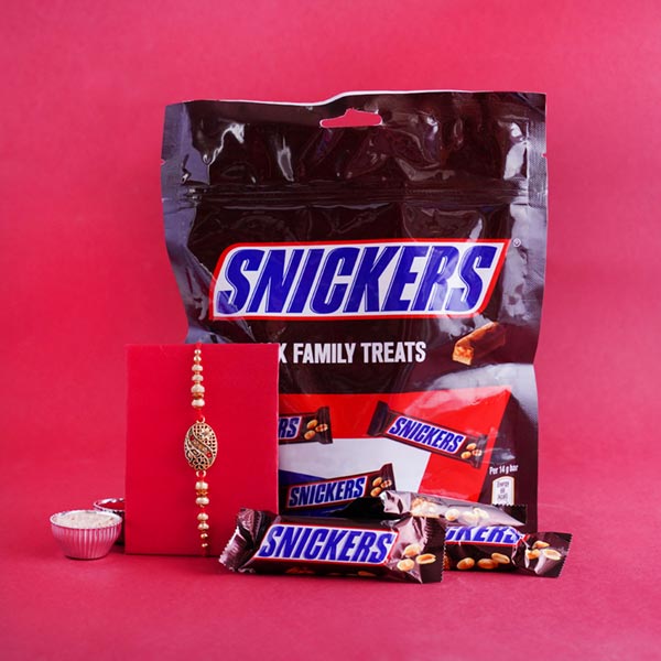It contains: • Rakhi Type: Designer Rakhi • Set Type: Single Rakhi • Color: Gold and Red • A packet of Roli and rice with containers Chocolate • Snickers Family Treat Chocolates Pouch 168gm