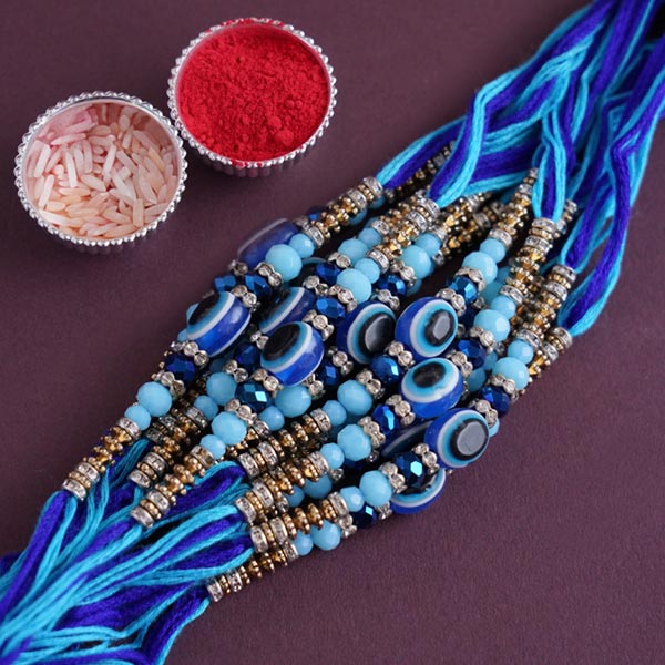 Product Details: • Rakhi Type: Twelve Designer Evil Eye Rakhi Set • Set Type: Set of Twelve • Recipient: Brother • Color: Multicolored • Material Used: Evil Eye stones, beads, and a silk thread • Brand: sendrakhi.com • Roli & Chawal with containers are included with this Rakhi set