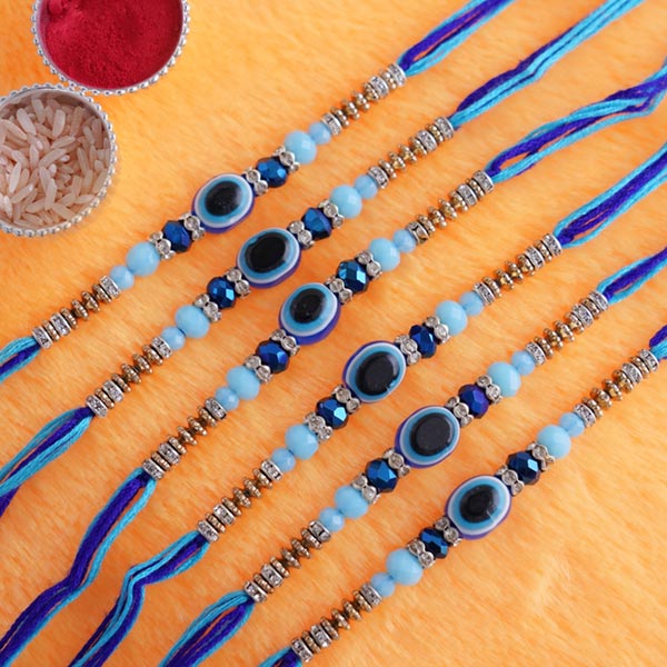 Product Details: • Rakhi Type: A Set of Six Evil Eye Rakhis • Set Type: Set of Six • Recipient: Brother • Color: Multicolored • Material Used: Evil eye motifs, beads, and a silk thread • Brand: sendrakhi.com • Roli & Chawal with containers are included with this Rakhi set