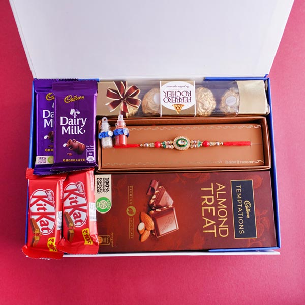 The Signature Box Contains: • One designer Rakhi in a box • Two Dairy Milk chocolates of 13.2 gm each • Two KitKat chocolates of 12.8 gm each • One Temptation of 72 gm • Four pieces of Ferrero Rocher chocolates • Roli and Chawal in containers with the designer signature box