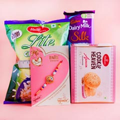 Product Details: • One designer Rakhi for brother • 250gm of Haldiram Kaju Kalash • 500gm of Haldiram Bhakar Badi • Roil and chawal with containers are also included Note: The wooden tray shown here in the image is not included with the hamper. It is only for decoration.