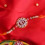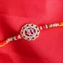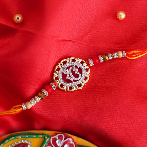 Product Details: • Rakhi Type: Shree Rakhi in a box • Set Type: Single Rakhi • Recipient: Brothers • Color: Multicolored • Material Used: Gold-plated metal, AD stones, beads, and Mauli threads • Brand: Sendrakhi.com • A packet of Roli and Chawal with containers are also included