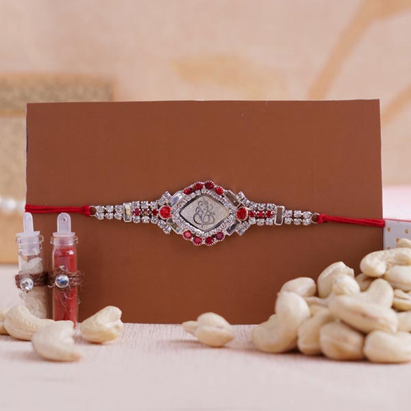 Rakhi • Rakhi Type: Designer Silver Rakhi • Set Type: Single Rakhi • Recipient: Brothers • Color: Multicolored • Material Used: Silver-platted metal, beads, stones, and silk threads • A packet of Roli and Chawal with containers Dry fruits • 100 gm Cashews in a designer golden container