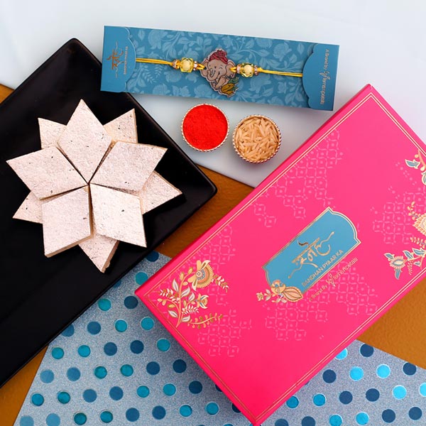 Product Details One Bal Ganesha Kids Rakhi, Bal Ganesha Rakhi is categorically designed for kids who are fond of devotional cartoon characters, This Rakshabandhan, gift your brother a classic designer Rakhi, Haldiram Kaju Katli, Weight- 250 gms