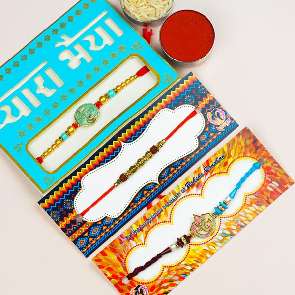Set of 3 Rakhis ( 1 Rudraksh Rakhi, 1 Radhe Radhe Rakhi & 1 Ganesha Rakhi )