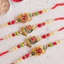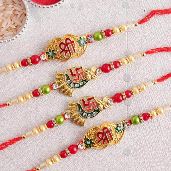 Product Overview: • Rakhi Type: A pair of each golden Shri Rakhi and Swastika Rakhi • Set Type: Set of 4 Rakhi • Recipient: Brothers • Color: Multicolored • Material Used: Stones, beads, gold-plated metal, and silk thread • Roli & Chawal pack and containers are included with Rakhi set
