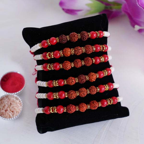 Product Details: • Rakhi Type: A set of six Rudraksha Rakhis • Set Type: Set of Six • Recipient: Brother • Color: Multicolored • Material Used: Rudraksha, beads, and a silk thread • Brand: sendrakhi.com • Roli & Chawal with containers are included with this Rakhi set