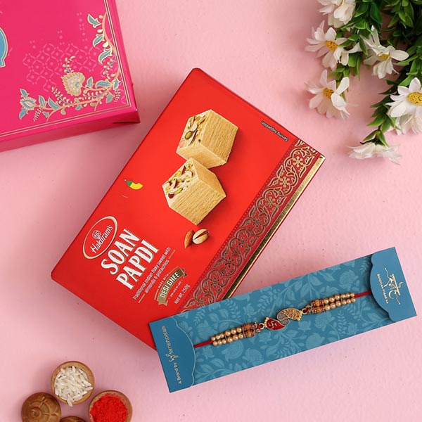 Product Details One Swastik Paduka Rakhi, This ethnic rakhi displays swastik paduka for a divine look, Haldiram''s Soan Papdi, Weight- 250 gms, Complimentary Roli Chawal packed in a small card, Beautifully packed in Sneh Box,