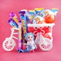 It contains: • Rakhi Type: Kids Rakhi • Set Type: Single Rakhi • Color: Blue • A packet of Roli and rice with containers Chocolate • Two Cadbury Perk • Two Munches • Two Kinder Joy 20gm • Jolly Rancher Lollipops, 63gm (Pack of 16) Other Items • One Designer White Cycle (Show Piece)