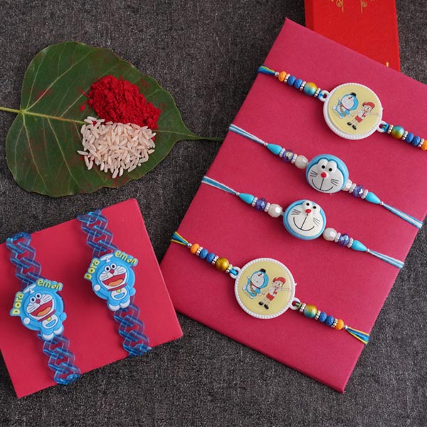 Product Details: • Rakhi Type: Set of Six Doraemon Rakhis • Set Type: Set of Six • Recipient: Brother • Color: Multicolored • Material Used: Plastic, silicone, and a designer band • Brand: Sendrakhi.com • Roli & Chawal with containers are included with this Rakhi set