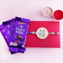 Product Details: • Doraemon Kids Rakhi • Four Cadbury Dairy Milk chocolates of 13gm each • Roli and Chawal with containers are included