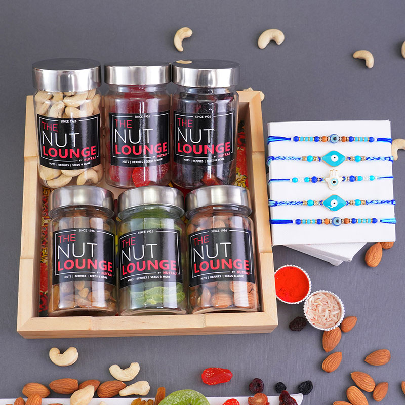 Dry Fruits with Set of Five Evil Eye Rakhis N Wooden Tray